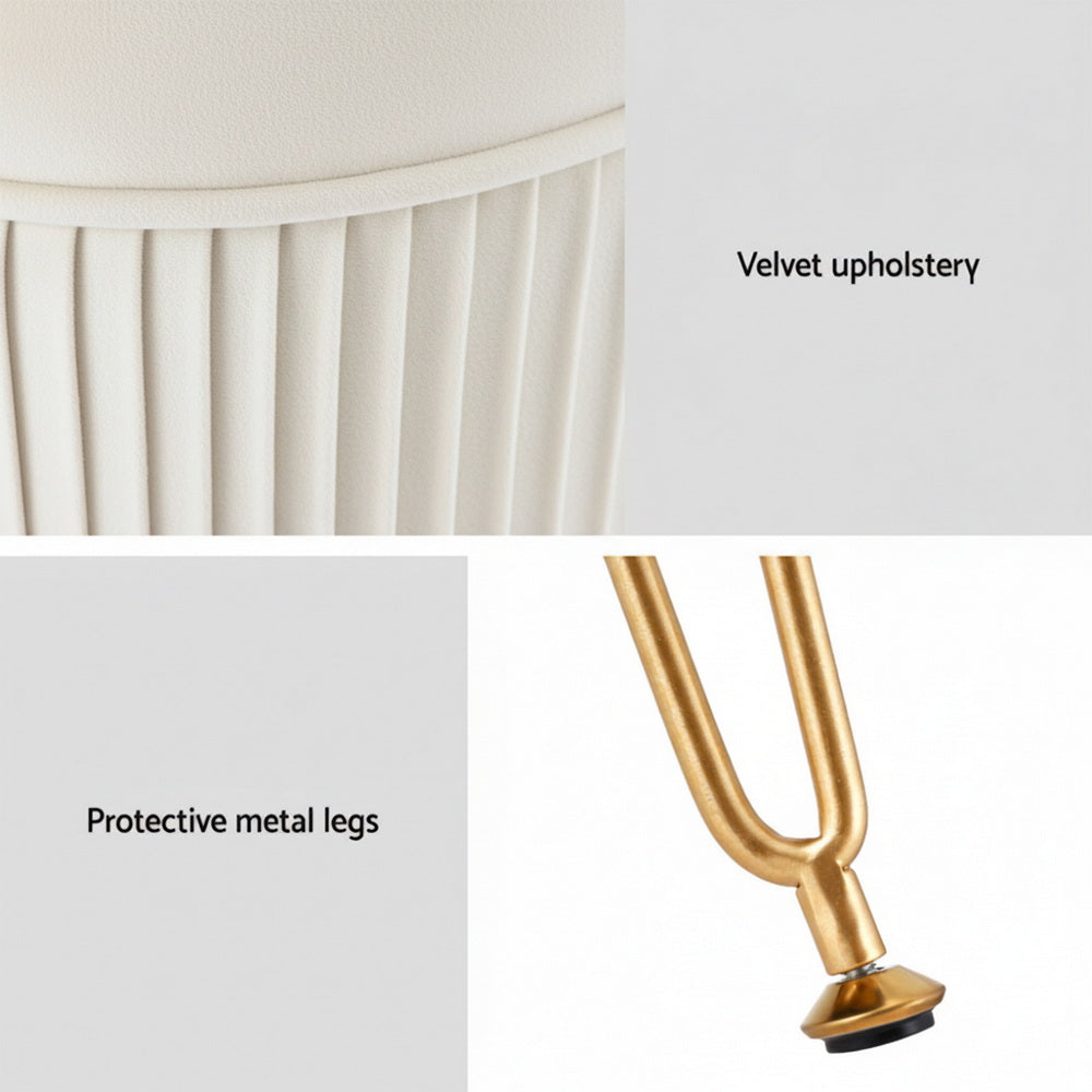 Round velvet Artiss footstool with vertical stripe design, durable MDF frame, and high-resilience foam padding. Features protective metal legs and simple assembly.