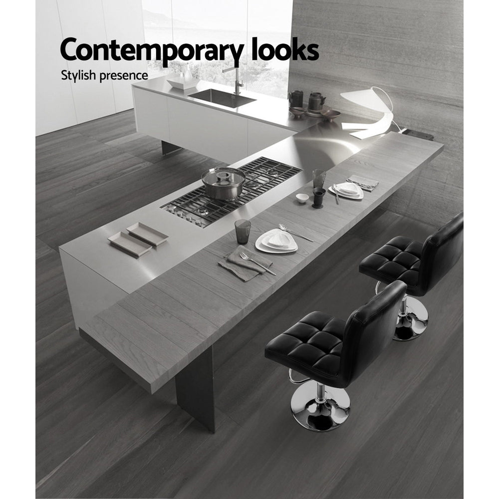 These modern bar stools are sure to complement any household and will be a great addition to a kitchen and dining setting. Upholstered in faux leather, the bar stools also feature an extra thick foam padding seat for ultimate comfort. The semi-circular footrest ensures relaxed sitting while the omni-directional seat makes for easy turn to any facing. Better still, the height can be easily adjusted with the SGS-tested gas lift and the large base ensures stability at all times. Not least, a floor protector under the base helps to keep your pristine floor scratch-free at all times.